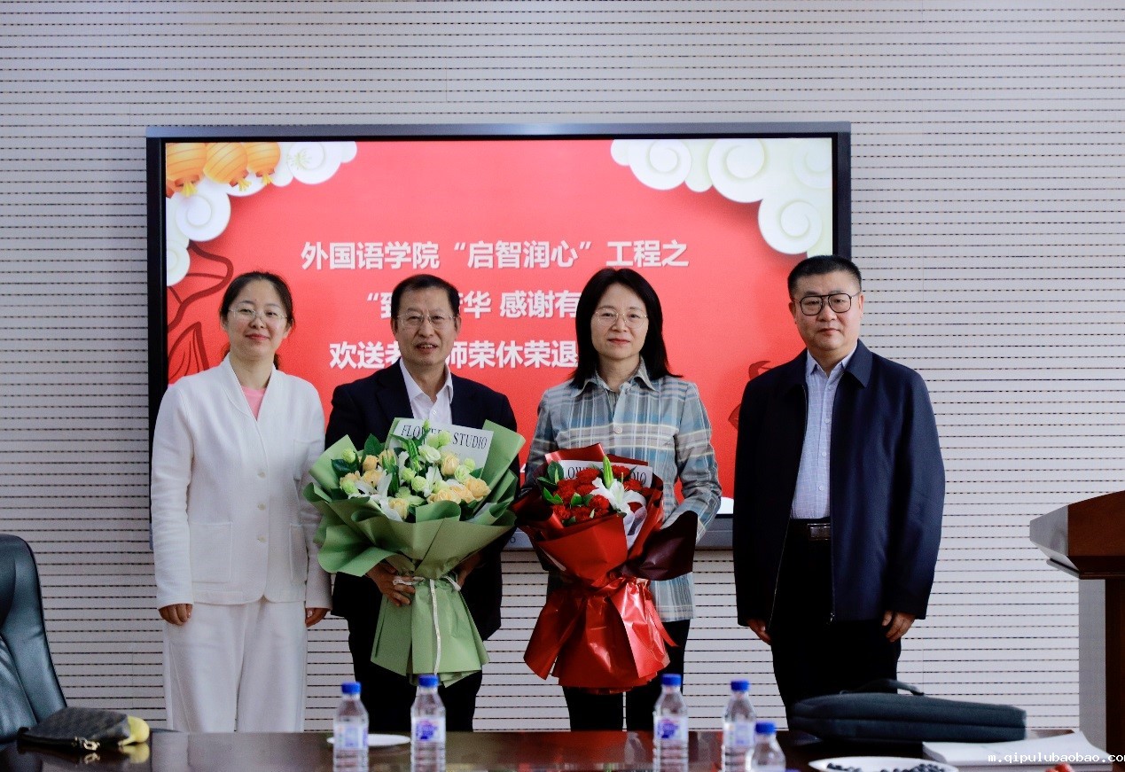 座谈会伊始,学院党委书记首先高度赞扬了荣休荣退教师们四十余年坚守教育初心,用知识照亮学子前行之路,为学院、学校教育事业发展所做出的重要贡献,并表达了感恩感谢与由衷敬意。接着,进入座谈会的核心环节。荣休荣退教师们逐一分享了各自的从教经历与深刻体会。他们深情回顾了与学生共度的难忘岁月,讲述了在教学科研中的执着探索与丰硕成果,言语间流露出对教育事业的深深热爱与无尽眷恋。他们的肺腑之言,引发了在场同仁的共鸣,现场掌声不断,既是对他们辉煌职业生涯的致敬,也是对他们未来生活的美好祝愿。随后,老教师们满怀期待地对学院教职员工的未来发展提出了寄语与期许。他们勉励年轻一代教师要继承和发扬外语人的优良教育传统,永葆教育情怀,不断提升专业素养,以适应时代发展对教育的新理念与新要求。同时,他们还就学院事业的发展提出了宝贵建议,展现了60后外语教育工作者在离任之际,仍心系学院,情牵外语教育的高尚情怀。期间多位在岗教师与两位老师现场做了互动交流。座谈会尾声,学院院长就本次活动做了总结讲话并期待五位荣休荣退教师做好未来生活安排,持续关心关注学院事业发展。最后学院领导代表全院师生向荣休荣退教师献花,再次表达了对他们辛勤付出的崇高敬意与衷心感谢,祝福他 们在新的生活阶段身体健康,万事顺心。