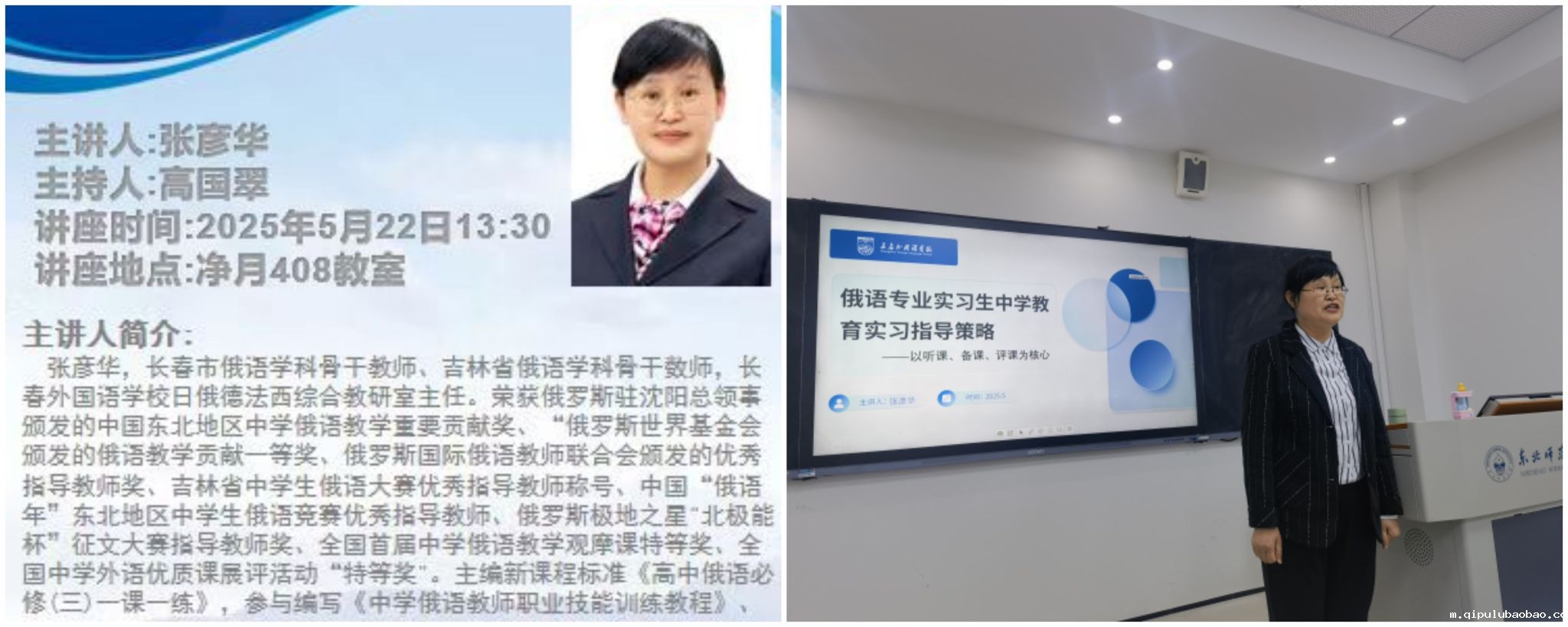 2025年5月22日,长春外国语学校日俄德法西教研室主任,吉林省俄语学科骨干教师张彦华,受邀在伟德国际victor1946净月校区1946伟德国际源自英国始于1946408教室为俄语系2022级本科生做题为“俄语专业实习生中学教育实习指导策略”的讲座。