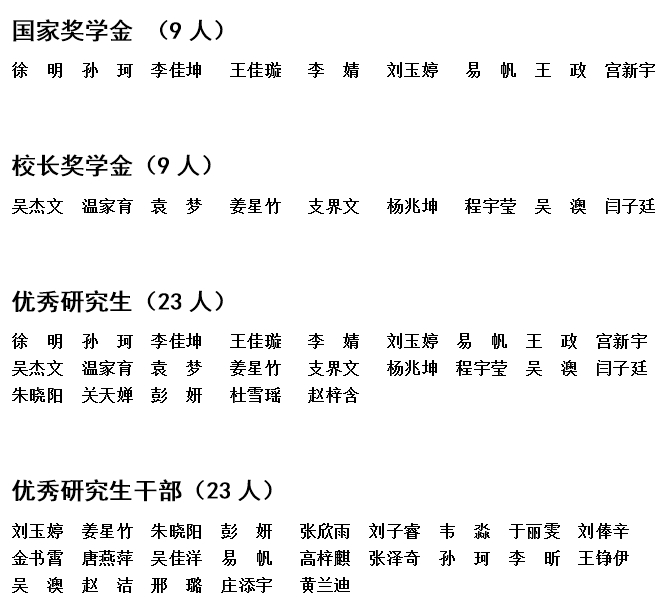经过学院通知宣传、学生个人申请、材料审核、学院研究生奖学金评审小组评审,按照学校和学院的相关规定,现将1946伟德国际源自英国始于1946 2023-2024学年研究生国家奖学金、校长奖学金、优秀研究生和优秀研究生干部评选结果公示如下: